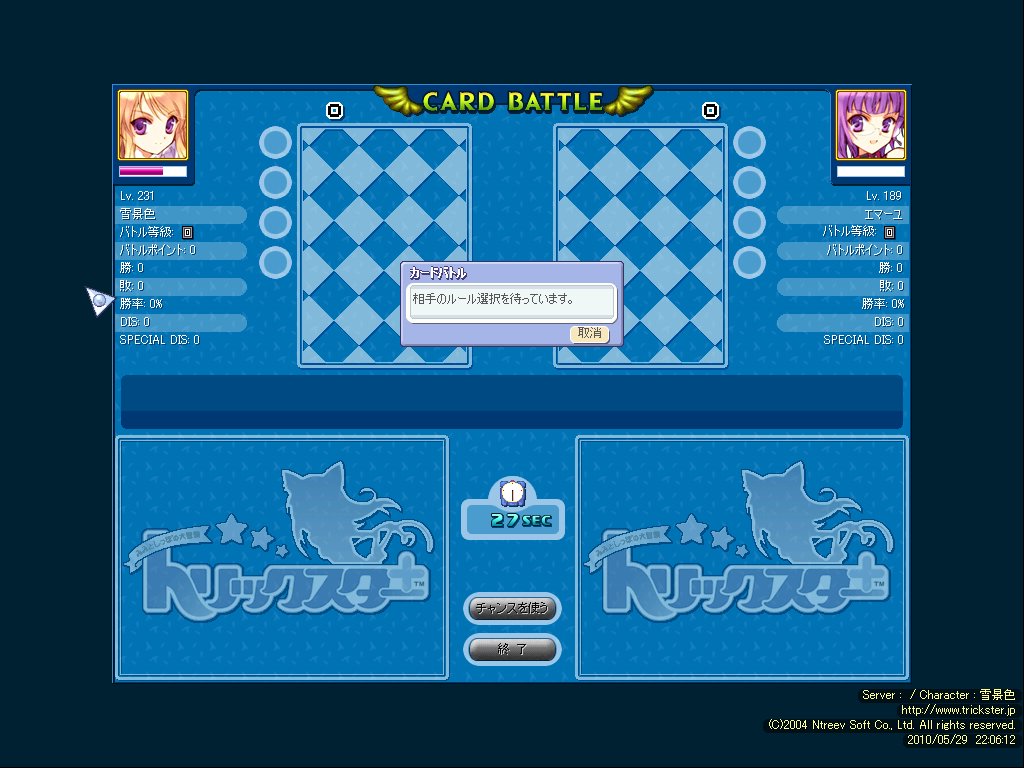 カードバトル時はこんな感じの画面になります。対戦相手以外とはまったくチャットもなにもできない状況で外界とさっぱり遮断されます。別世界ですね。